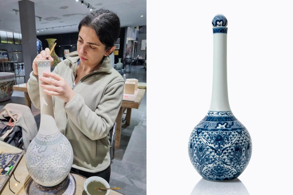 For instance, I often use pattern design techniques from Turkiye and mix them with Chinese ceramic materials. Sometimes, I even incorporate Chinese motifs into my work. When Chinese people first glance at my designs from a distance, they assume it’s purely Chinese. But as they get closer, they realize there’s a blend of both cultures in my blue and white pieces. Then, they start chatting about the connection between Iznik and Jingdezhen, which really makes me happy because it shows they appreciate and understand or see this cultural link.
